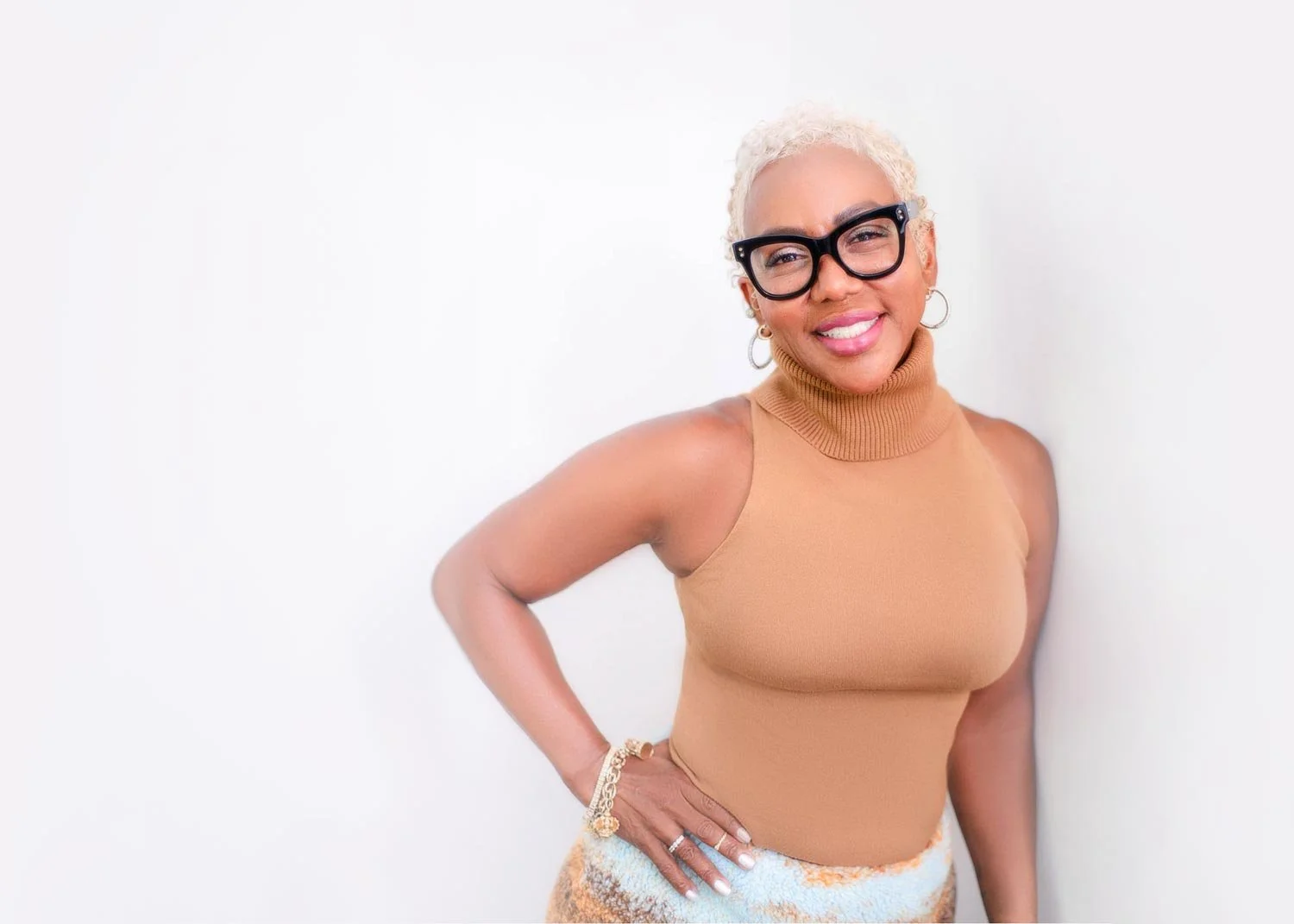 A woman with short, curly, platinum blonde hair, wearing black glasses, hoop earrings, a tan sleeveless turtleneck top, and a patterned skirt, standing against a plain white background, smiling at the camera.