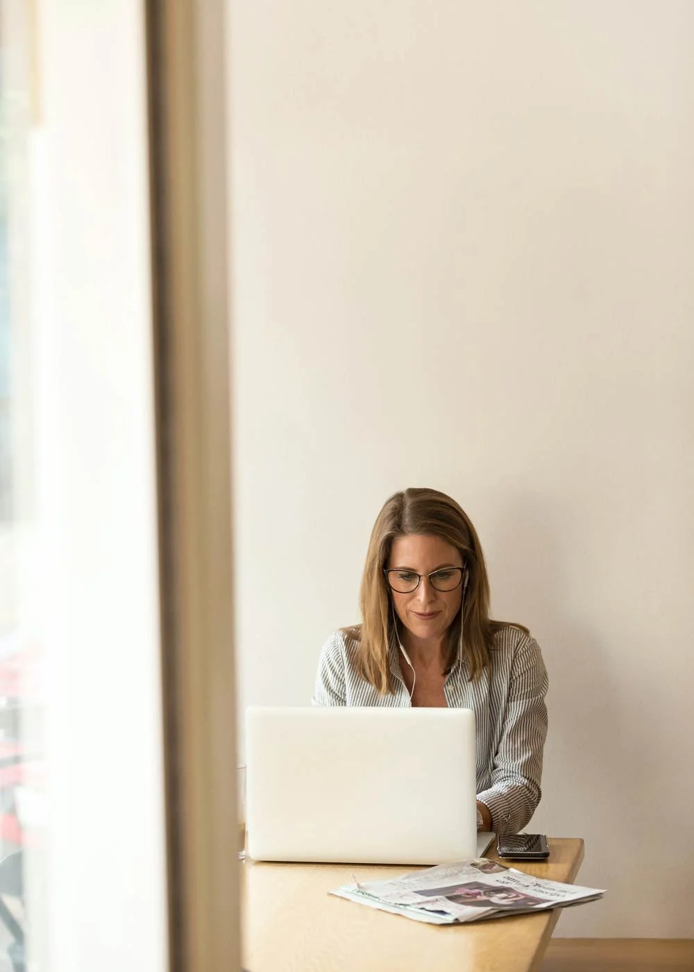A woman wearing glasses and earbuds works on a laptop at a wooden table with newspapers and a smartphone, seen from the side through a doorway.
