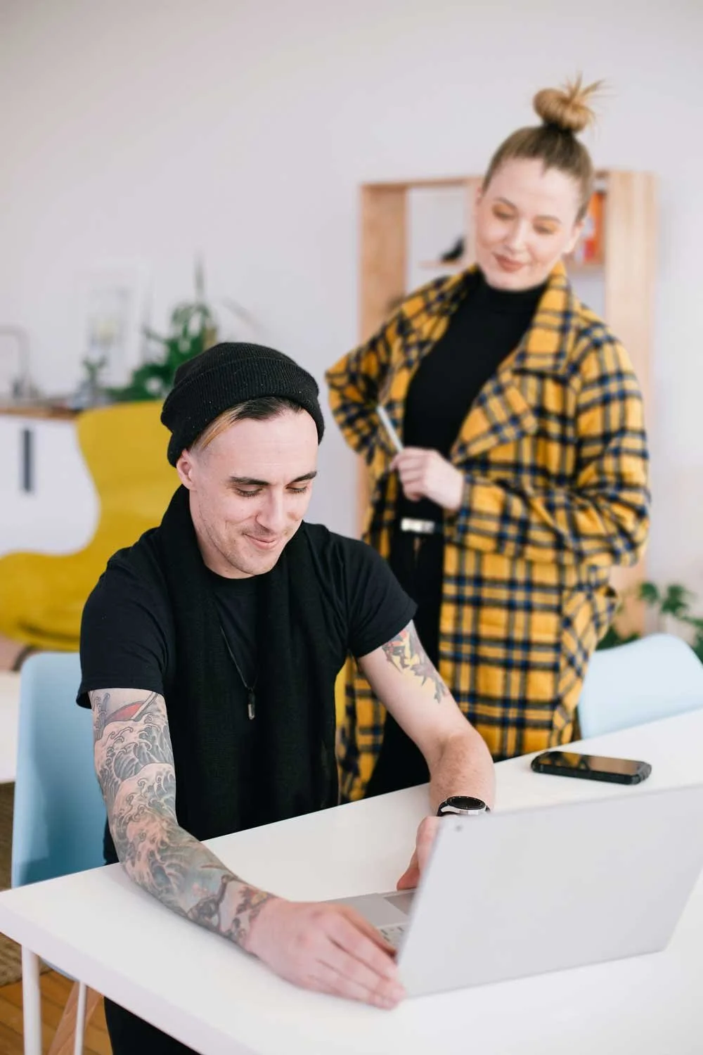 A young man with tattoos and a black beanie sitting at a white table, working on a laptop, while a woman in a yellow and black checkered jacket stands behind him, smiling.